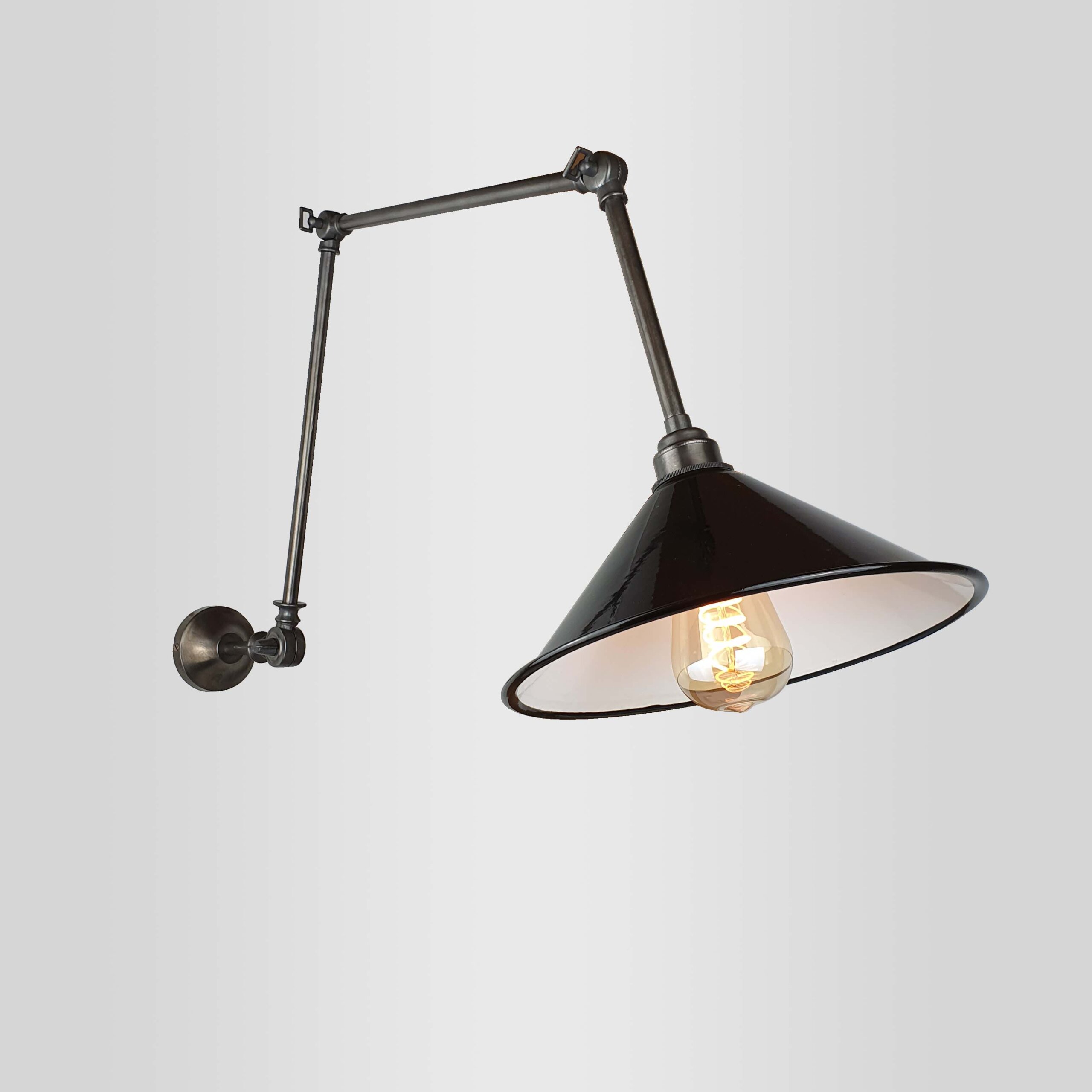 Adjustable angled wall light with enamel shade. Available in Polished Brass, Satin Brass, Antique Brass, Bronze or Pewter.