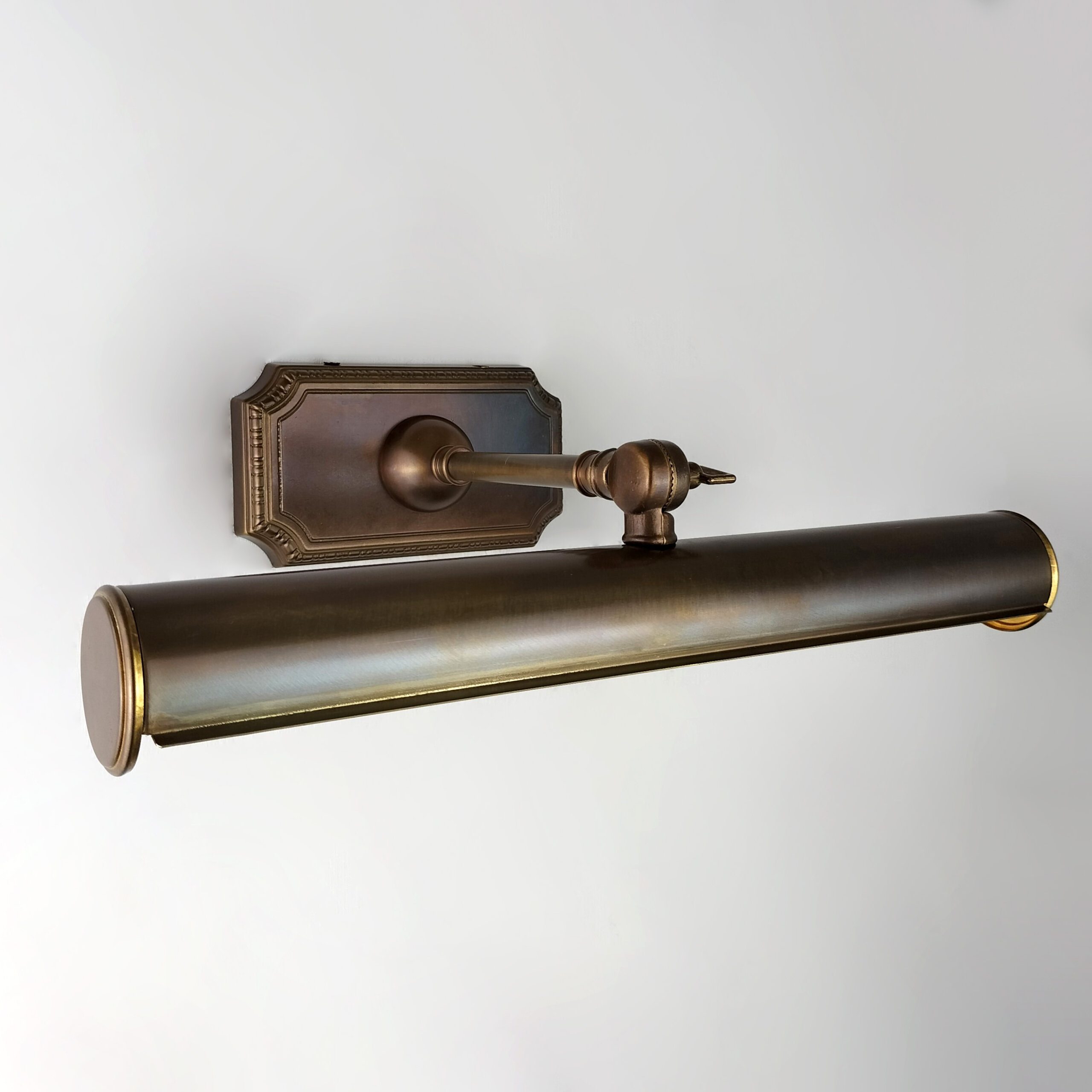 Brass picture light with adjustable arm. Available in five different finishes.