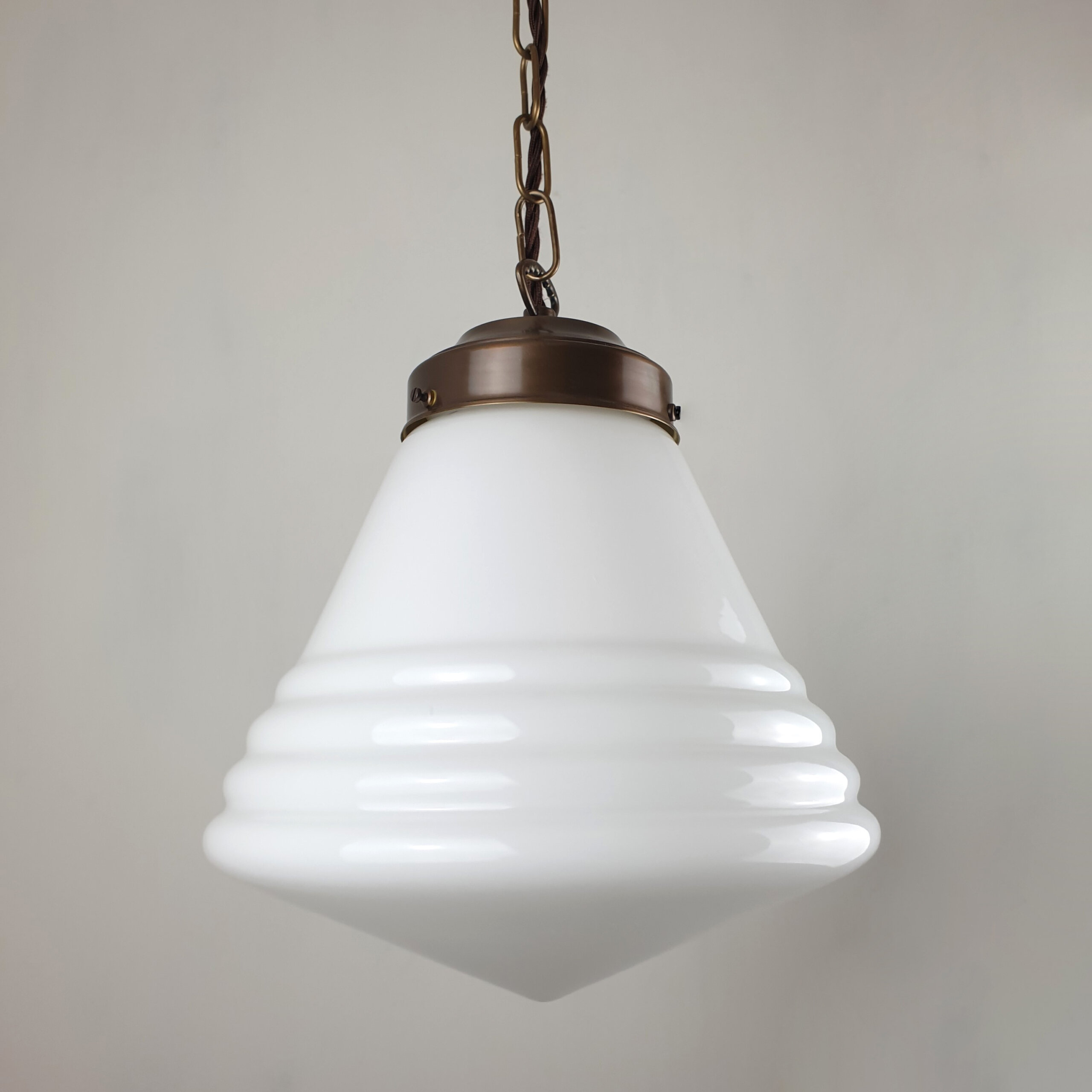 Art deco style opal glass shade pendant. Available in five different finishes.