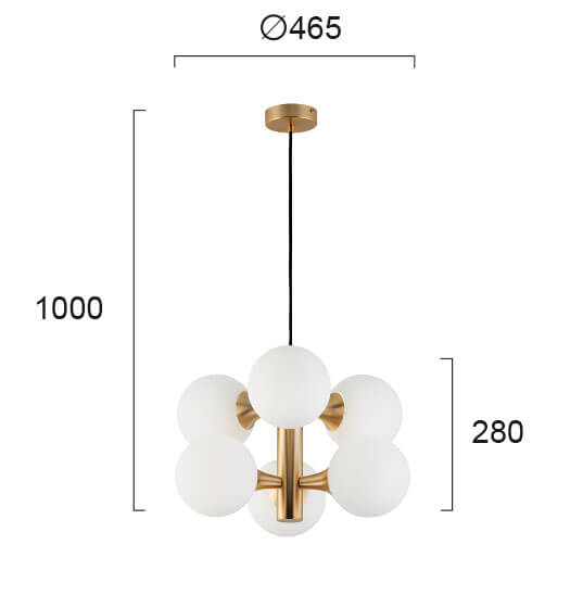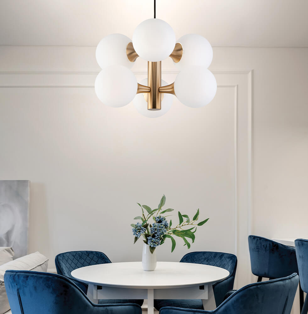 A modern 6 light pendant that blends sleek metalwork with a smooth opal glass diffuser, creating a warm and inviting glow. The combination of a black finish with gold detailing adds a touch of sophistication, making it an ideal choice for both contemporary and transitional interiors.