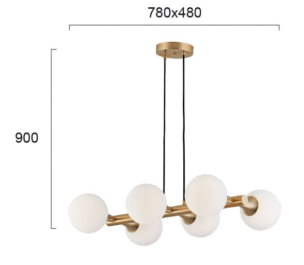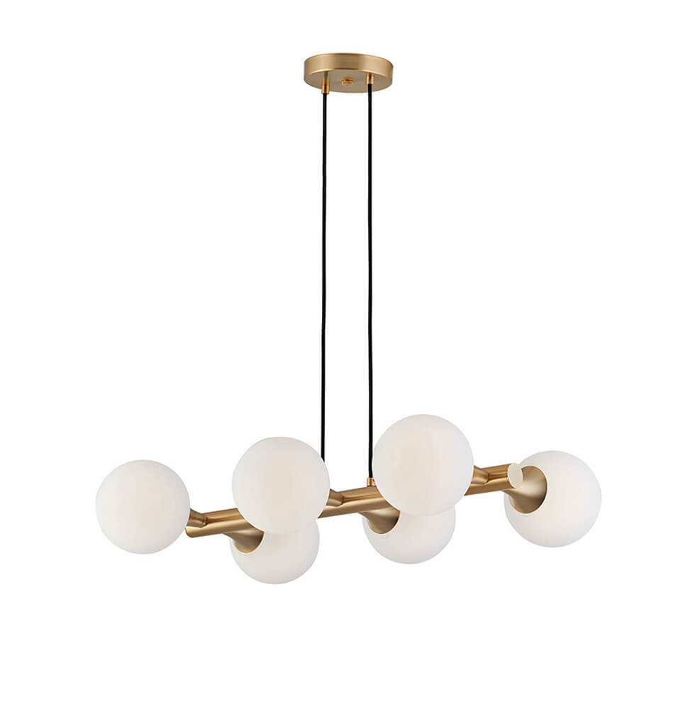 A contemporary bar pendant featuring six opal glass globes suspended from a sleek black and gold frame. Designed to provide both elegance and practical illumination, it makes a striking addition to hospitality, contract, or residential interiors.
