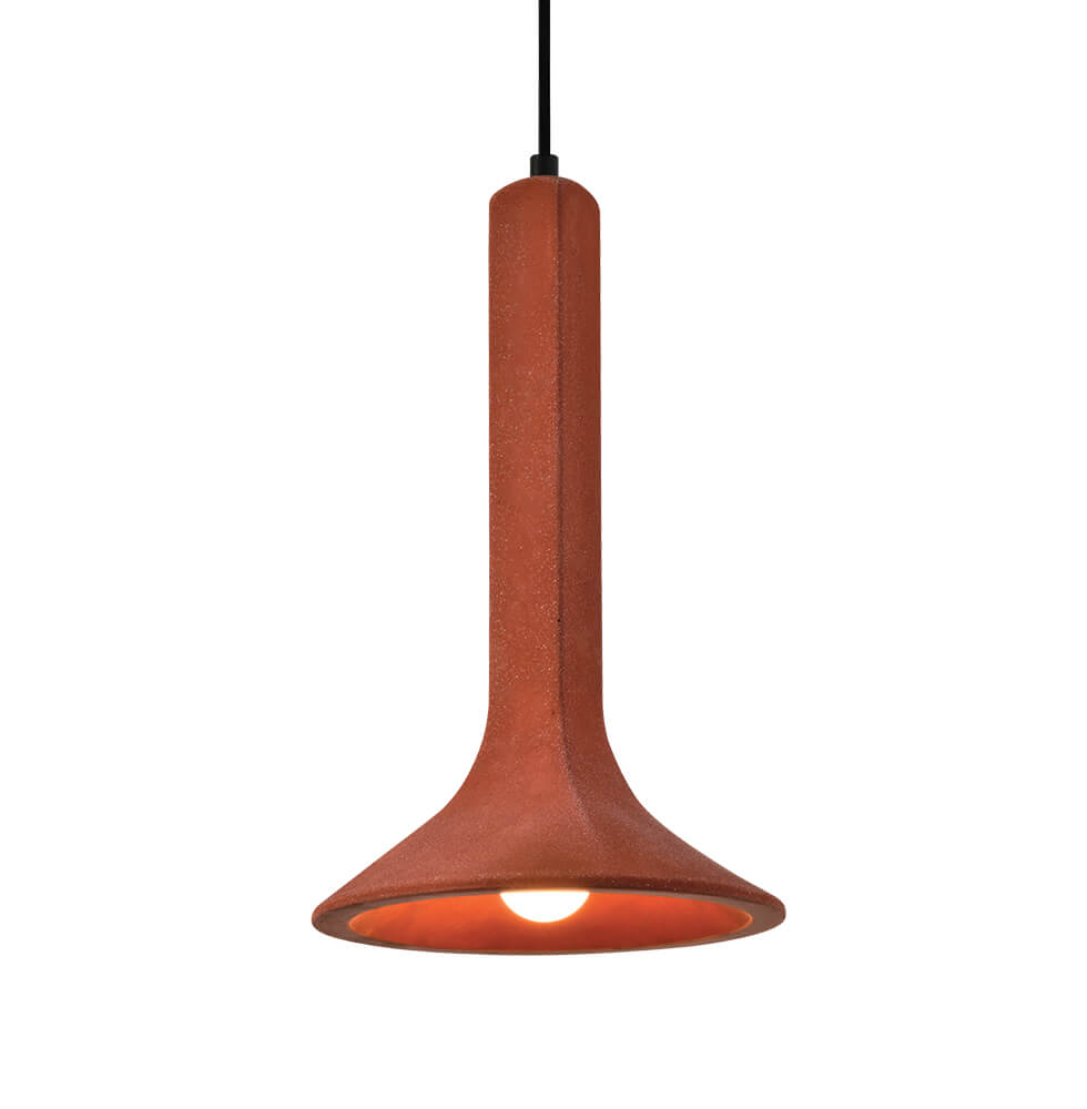 A striking pendant with a bold red concrete shade in a funnel form, suspended from a sleek black metal canopy. Its vibrant industrial aesthetic brings a sculptural yet warm touch—ideal for café counters, dining zones, or contract interiors needing a splash of character.
