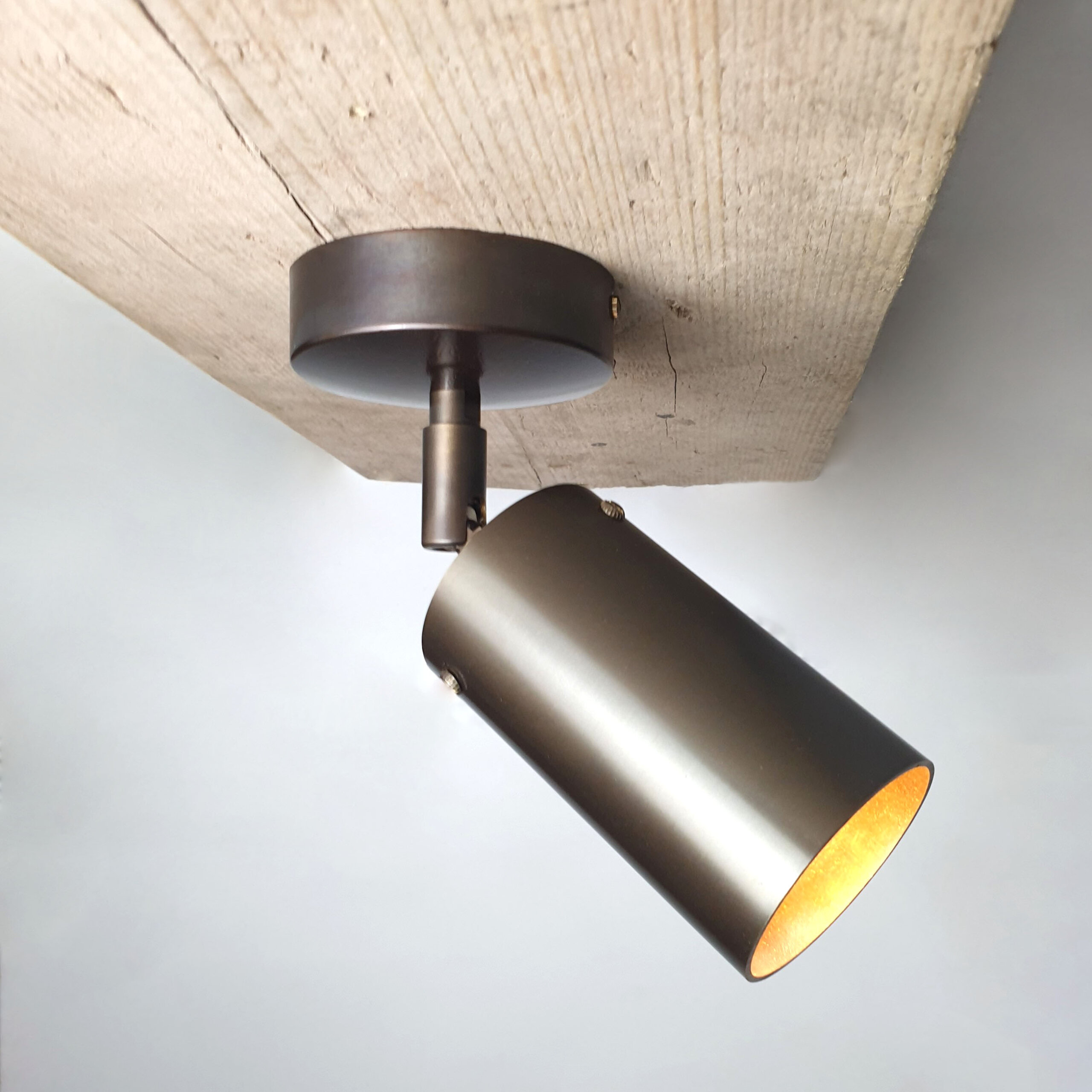 Subtle brass spotlight with cylinder metal shade. Available in five different finishes.