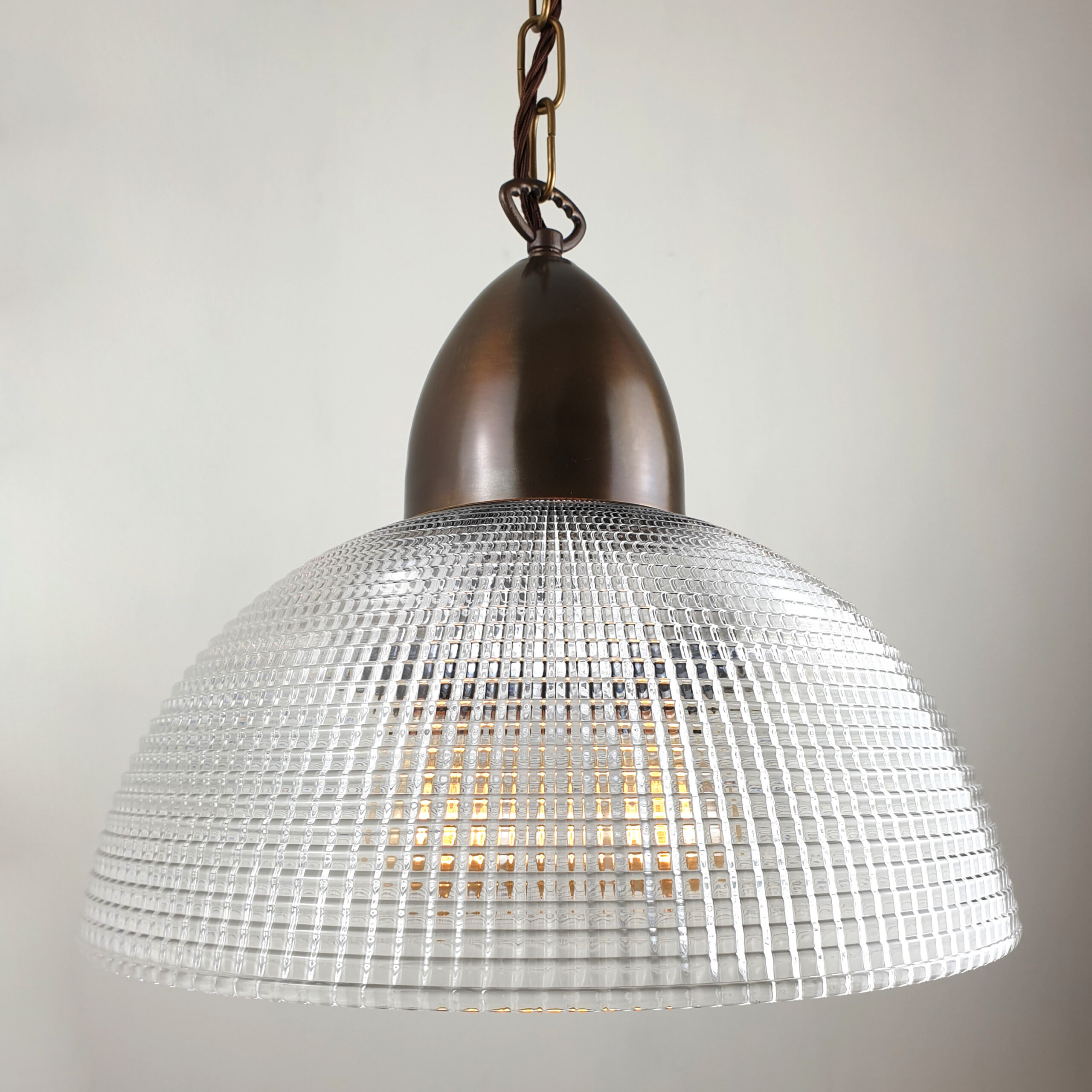Brass dome pendant with holophane glass dome. Available in Polished Brass, Satin Brass, Antique Brass, Bronze or Pewter.
