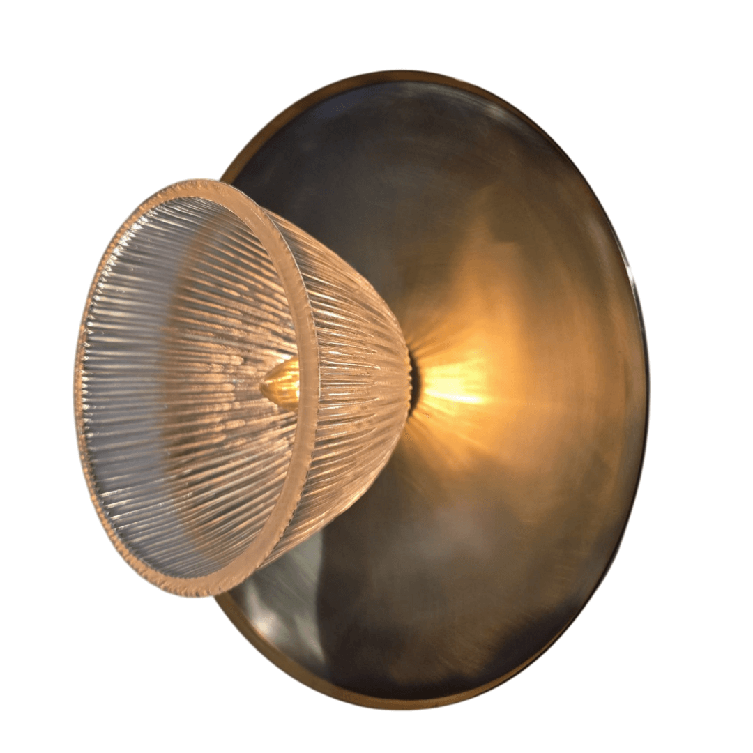 Brass wall light with prismatic cone shade. Available in five different finishes.