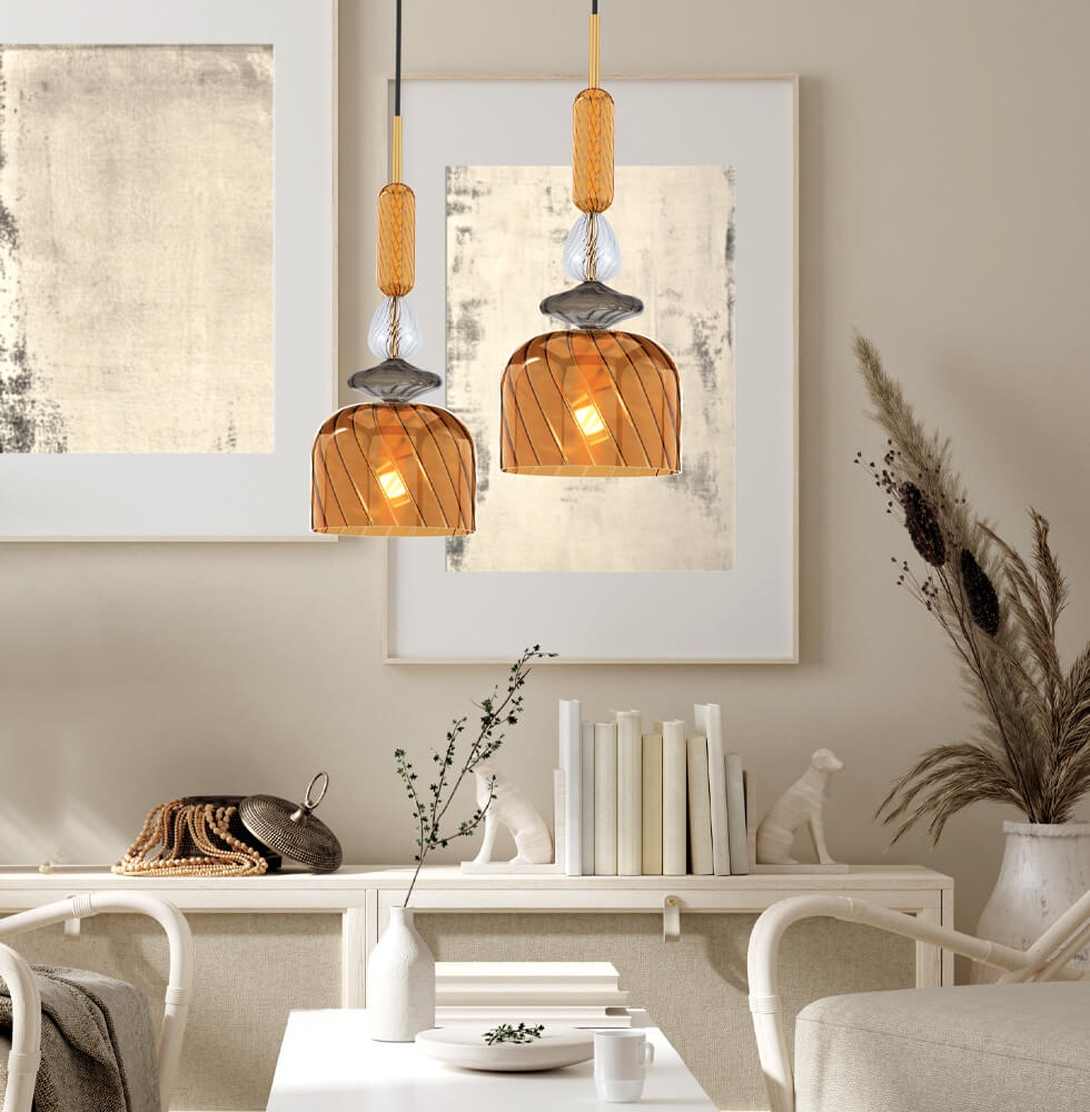 A refined pendant with a Amber-tinted glass shade and subtle metallic details. The amber finish diffuses light gently, making it perfect for dining and lounge areas with a modern aesthetic.