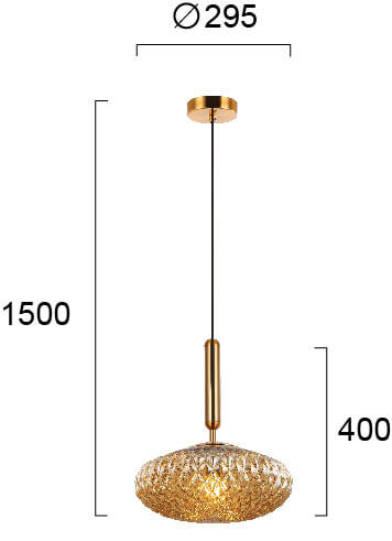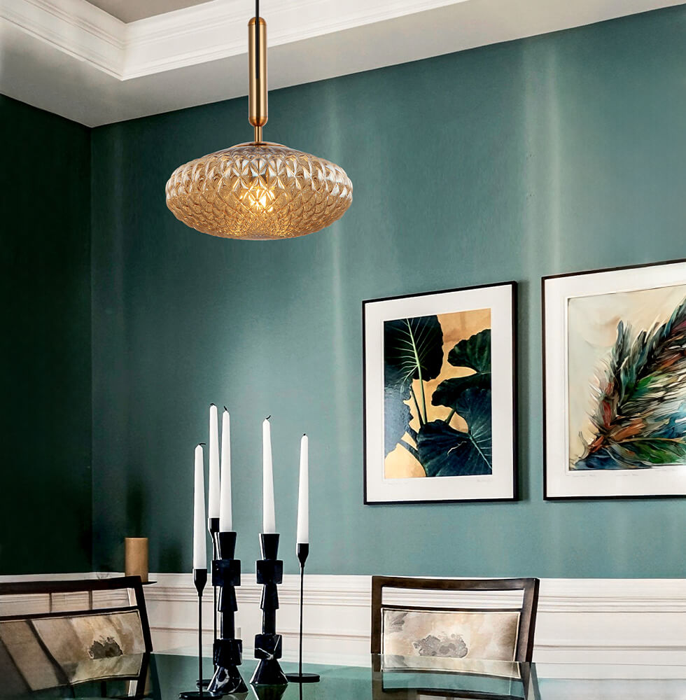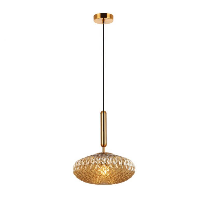 A refined pendant with a warm amber glass shade and brass-toned details, designed to cast a soft, atmospheric glow. Its elegant embossed finish adds texture and depth, making it a beautiful choice for dining areas, lounges, or hospitality spaces where warmth and sophistication are key.
