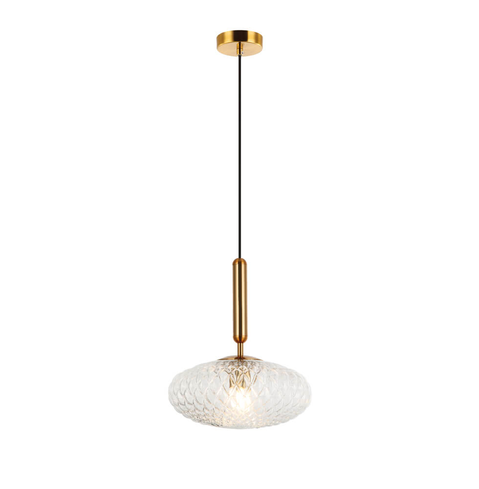 A refined pendant with a clear glass shade and brass-toned details, designed to cast a soft, atmospheric glow. Its elegant embossed finish adds texture and depth, making it a beautiful choice for dining areas, lounges, or hospitality spaces where warmth and sophistication are key.