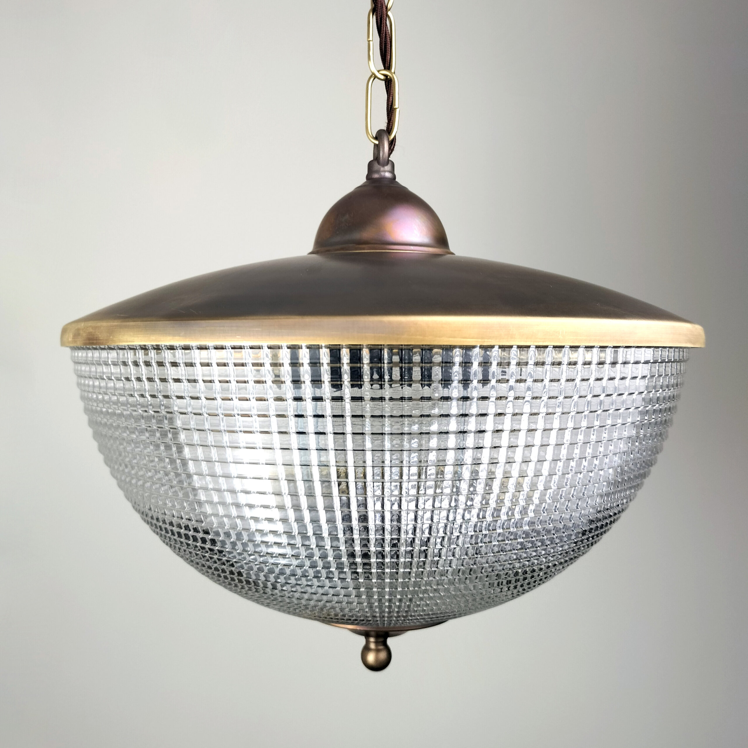 Holophane glass dome shade pendant with brass detailing. Available in five different finishes.