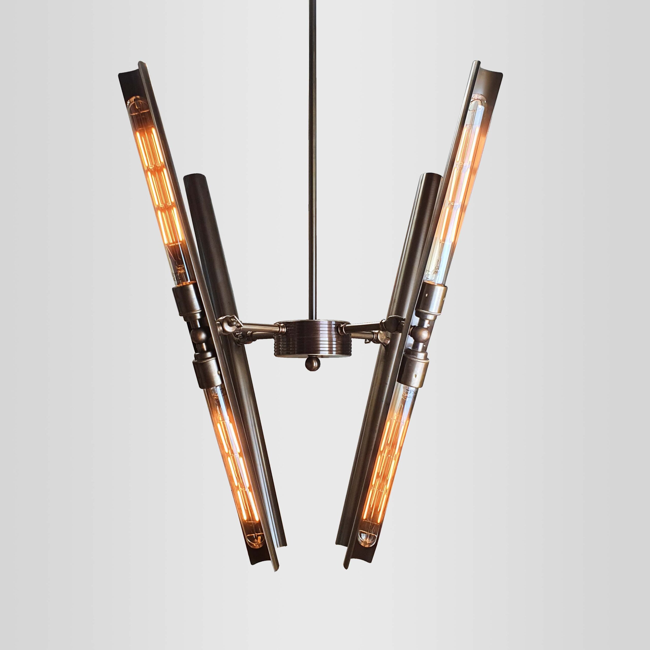 Industrial exposed bulb four-arm pendant. Available in Polished Brass, Satin Brass, Antique Brass, Bronze or Pewter.