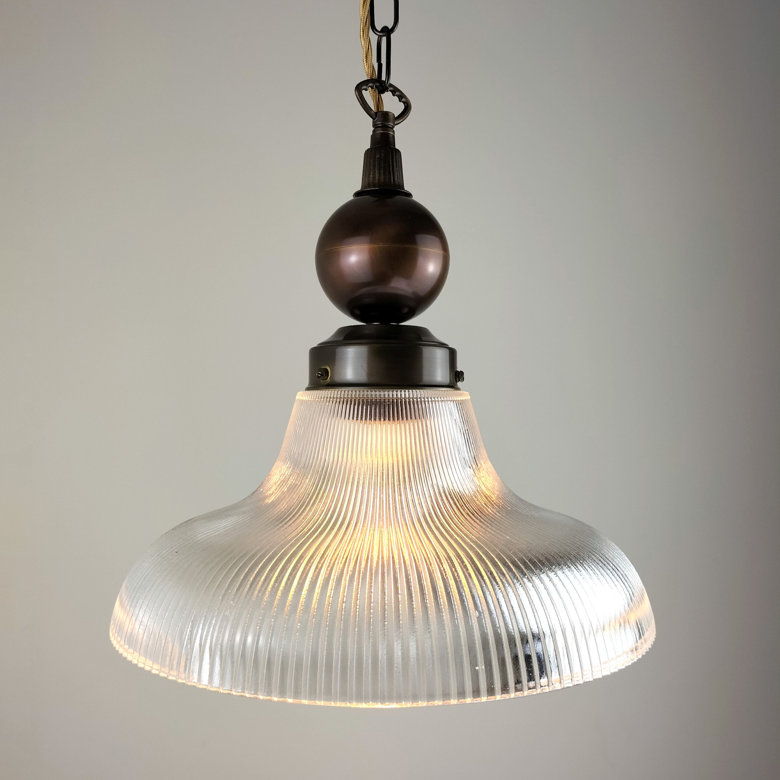 Brass sphere detail pendant with prismatic railroad glass shade. Available with clear or frosted glass, and in five different finishes.