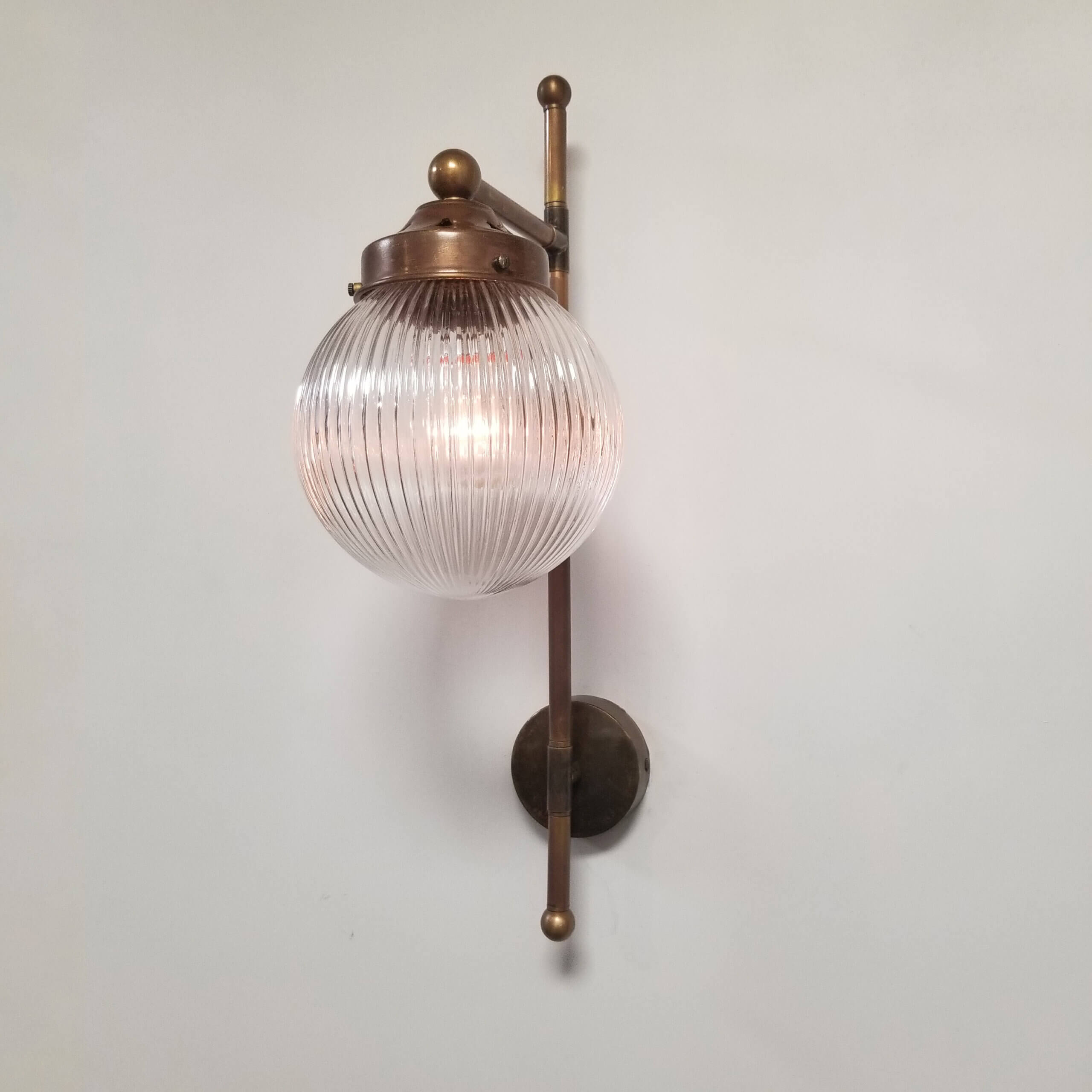 Traditional brass wall light with prismatic glass globe. Available in Polished Brass, Satin Brass, Antique Brass, Bronze or Pewter.