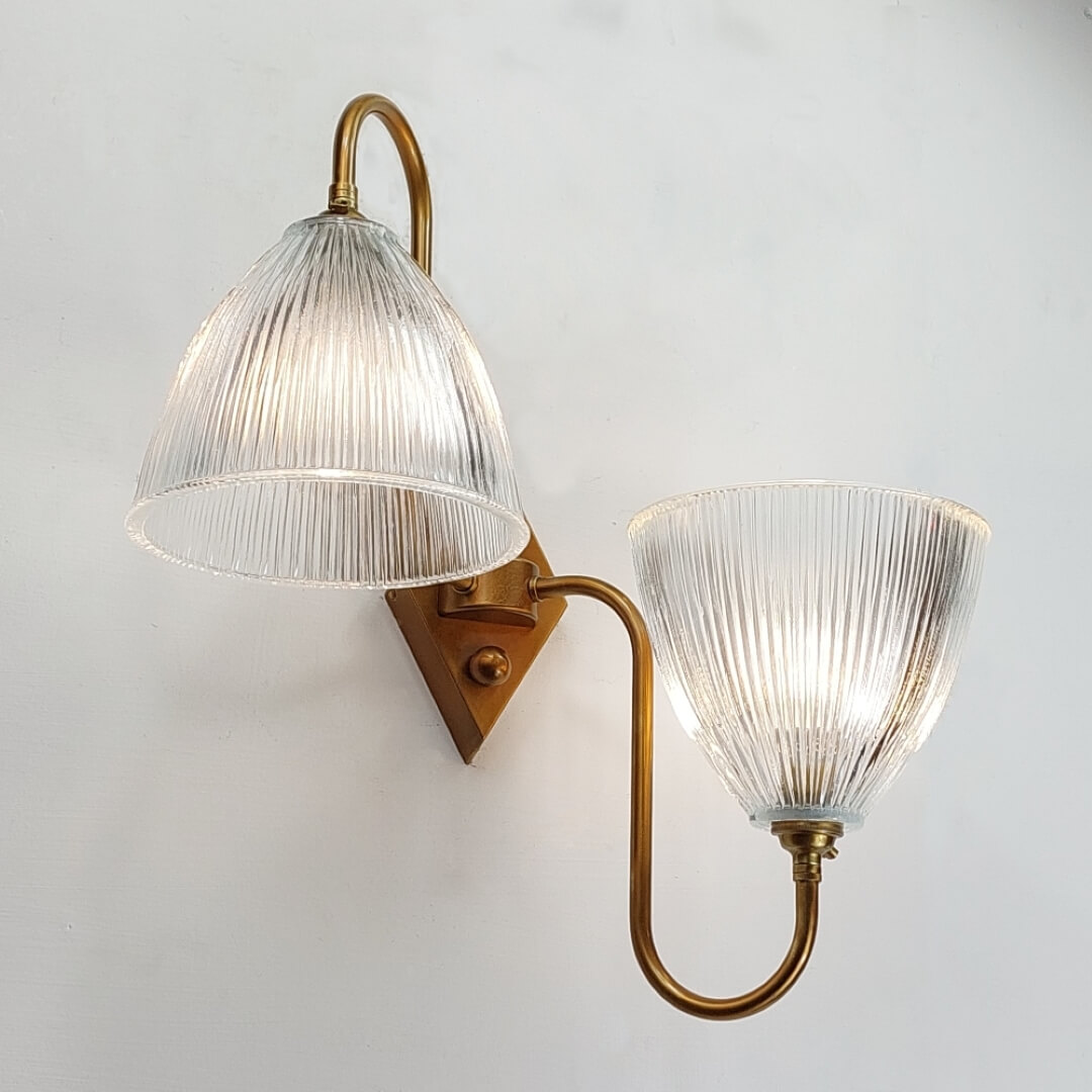 Introduce timeless elegance to your home with the Twin Arm Wall Light with Prismatic Glass Shade. A beautifully designed dual‑light fixture that blends vintage charm with modern craftsmanship. Featuring two prismatic ribbed glass shades and warm antique brass finish. Without a doubt this wall light delivers a classy glow while serving as a standout decorative feature in any interior space.