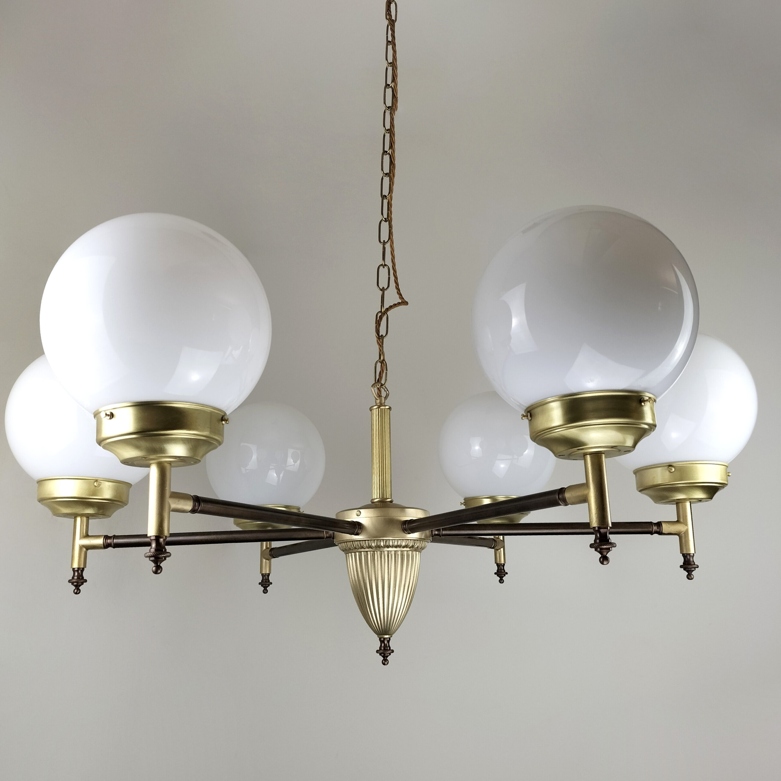 Two-tone brass chandelier with 6 opal glass globes. Available in five different finishes.
